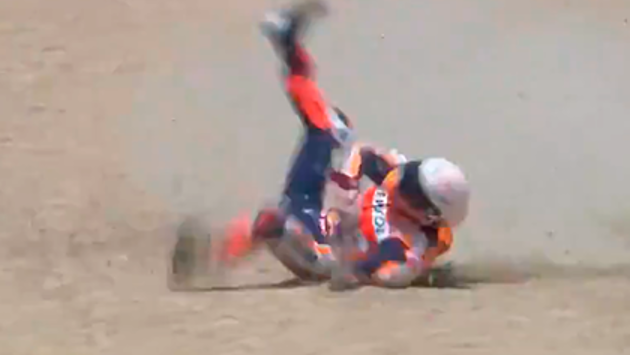 Испанский мотогонщик, пилот команды Repsol Honda Team Марк Маркес попал в аварию на этапе Гран-при MotoGP в Испании. Видео опубликовано в Twitter MotoGP.
