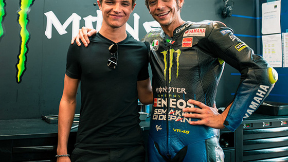 Валентино Росси, выдающегося итальянского мотогонщика, девятикратного чемпиона мира, можно считать примером спортивного долголетия, ведь он выступал в MotoGP более двух десятилетий, но и до этого провёл несколько сезонов в других классах. В целом его карьера в кольцевых мотогонках продолжалась более четверти века, а сейчас Росси выступает уже на четырёх колёсах в серии GT World Challenge Europe за бельгийскую команду WRT, причём всё под тем же номером 46. Среди гонщиков современной Формулы 1 немало поклонников его таланта, и один из них – Ландо Норрис. Британский пилот McLaren рассказал об этом официальному сайту чемпионата… Сначала я обратил внимание на Валентино из-за его выбора цветовой гаммы. Мне, наверное, было тогда лет пять, а когда ты в таком возрасте, если тебе что-то нравится, то лишь потому, что это классно выглядит. У него был бело-голубой мотоцикл Yamaha, гоночный комбинезон и шлем ярко-жёлтого цвета, и вообще он отлично смотрелся. Мне нравились его интервью, как он говорил с итальянским акцентом, нравилось, как он праздновал успехи – в общем, нравилось всё, что он делал. Так было, когда мне было 5 лет, и в то время у меня уже был квадроцикл, а потом появился и кроссовый мотоцикл. Что такое картинг, я узнал только в семилетнем возрасте. Конечно, я тогда любил смотреть мотогонки по ТВ. У Валентино было множество впечатляющих дуэлей, и среди лучших, которые мне запомнились, была его схватка с Кейси Стоунером на трассе в Лагуна-Сека, когда Росси опередил австралийца по обочине в повороте «Штопор». Другая дуэль происходила в Барселоне с Хорхе Лоренцо, и его Валентино обогнал в последнем повороте – это вообще один из самых ярких моментов! Когда я сам начал выступать в соревнованиях, оформление моего шлема было связано с Валентино. Я поручил дизайнеру, который этим занимался, создать нечто под девизом «Я болею за Росси!», и он разработал вариант в чёрно-оранжевой гамме, но с годами она несколько изменилась. Когда я рос, мне не доводилось бывать на гонках MotoGP, но когда я уже стал гонщиком Формулы 1, в 2021 году мне посчастливилось посетить этап в Сильверстоуне. И это было круто, ведь я до сих пор помню, как в детстве следил за выступлениями Валентино по ТВ. Это можно сравнить с тем, как я смотрел гонки Формулы 1 с участием Льюиса Хэмилтона или Фернандо Алонсо, а теперь мы вместе выступаем в чемпионате, и я с ними соперничаю. Когда я познакомился с Валентино, это было просто замечательно. Я тогда отправился в Сильверстоун прежде всего ради встречи с ним, ведь для меня это высокая честь. Он был моим кумиром, именно из-за него я сам начал выступать в гонках – кто знает, если бы я не болел за Росси и не начал гонять на мотоциклах, может, я вообще бы не занялся автоспортом, или этот интерес появился бы у меня позже. Мы продолжаем контактировать и после той встречи. Мой друг Тьери Вермюлен сейчас выступает в том же чемпионате GT World Challenge Europe, что и Валентино. Когда я поднялся на подиум в Сингапуре, Валентино прислал мне поздравительное сообщение, и мы периодически общаемся. Хотелось бы вместе с ним что-то сделать – разумеется, когда у него и у меня будет свободное время. Найти такую возможность довольно трудно, но это в планах на будущее. Также мне удалось чему-то научиться у Валентино – например, получать удовольствие от работы. Ему всегда нравилось дело, которым он занимается,