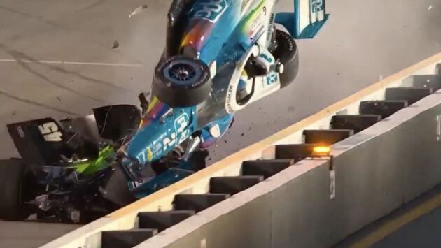 После столкновения с круговым машина лидера гонки IndyCar взмыла в воздух и перевернулась