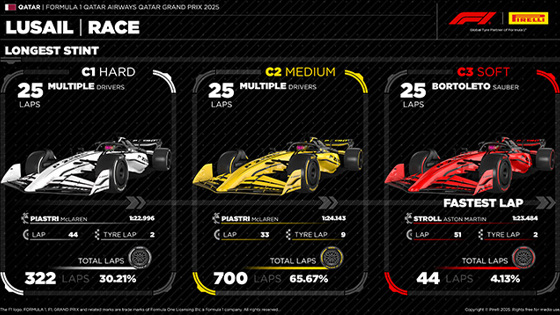В Катаре Pirelli ограничили максимальную продолжительность отрезка на одном комплекте шин 25 кругами, что свело на нет фактор стратегии, но позволило избежать повторения прошлогодних проколов на абразивном асфальте… Марио Изола, директор Pirelli по автоспорту: «Все стратегические решения в сегодняшней гонке обусловлены выездом автомобиля безопасности. Шины Medium стали хорошим компромиссом, позволив обеспечить достаточный уровень сцепления и высокую скорость на протяжении всего отрезка. Несмотря на то, что почти все гонщики использовали Hard только на последнем отрезке, состав С1 тоже продемонстрировал свою эффективность, порой позволяя показывать даже большую скорость, чем С2. По сравнению с предыдущими днями гранулирование проявлялось заметно меньше, что уменьшило случаи сильного износа, но не устранило их полностью. В результате было доказано, что ограничение в 25 кругов вполне позволяет избежать каких-либо проблем. Захватывающая интрига этой гонки и новые рекорды трассы, установленные на протяжении всего уик-энда, говорят о том, что в течение всего сезона конкуренция была более жесткой, чем когда-либо. Поэтому, пожалуй, нет ничего удивительного в том, что судьба титула решится на последнем этапе, где три очень достойных соперника проведут решающую битву».