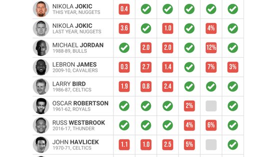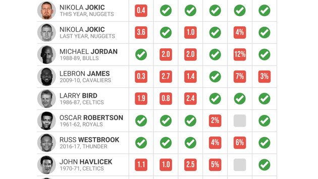 В итоге Йокичу не хватило 0,4 очка в среднем, чтобы добиться этих показателей. Итоговая статистика центрового – 29,6 очка, 12,7 подбора и 10,2 передачи при 57,6% с игры, 41,7% из-за дуги 80% с линии.