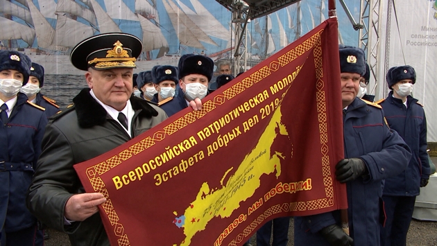 На паруснике в Калининград прибыло знамя «Эстафеты добрых дел». Акция посвящена 75-й годовщине Победы в Великой Отечественной войне. Эстафета стартовала год назад.