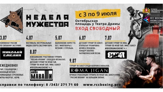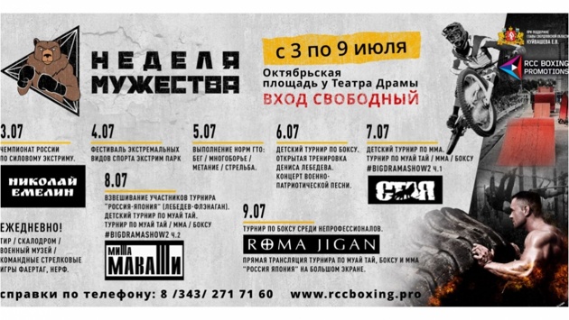 С высоты 45 метров. 3-9 июля 2017 года в уральской столице пройдет спортивно-массовое мероприятие "Неделя мужества". На площадке перед Театром драмы создадут специальный парк, где пройдут матчевые встречи по профессиональному, тайскому боксу и ММА. Также там состоятся чемпионат России по силовому экстриму и фестиваль экстремальных видов спорта, в рамках последнего намечено установить рекорд России по свободному падению в аэроподушку с высоты 45 метров. Ежедневно будут работать тир, площадка с водным оружием, музей истории Великой отечественной войны. Одновременно планируется организовать командные стрелковые игры, имитирующие боевые действия – фаертаг, NERF. Вход на все мероприятия в рамках "Недели мужества" свободный. Как сообщили "Уралинформбюро" в "РМК Боксинг Промоушенс", целей у подобного мероприятия несколько. Это не только популяризация здорового образа жизни, но и освоение навыков самообороны, а также привлечение внимания к такому виду единоборств, как бокс. Завершится "Неделя мужества" 9 июля во Дворце игровых видов спорта масштабным боксерским и ММА-турниром. В турнире примут участие 10 пар российских и японских бойцов. В ходе матчевой встречи будет разыграно несколько международных титулов, в том числе титул чемпиона мира по боксу по версии Всемирной боксерской ассоциации (WBA). На ринге встретятся действующий чемпион мира WBA россиянин Денис Лебедев и австралиец Марк Флэнаган (№8 в рейтинге WBA). Кроме того, в турнире примут участие такие звезды бокса, как Дмитрий Михайленко, Павел Маликов, Марк Урванов, Вадим Кафаров, и другие.