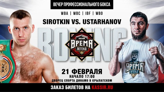 21 февраля в вечере профессионального бокса Время легенд: Москва состоится очень интересный поединок между обладателем титула WBC Asian Boxing Council Continental в среднем весе Апти Устархановым (18-3-3, 5 КО) и участником прошлогоднего отборочного поединка во втором среднем весе Андреем Сироткиным (16-1, 5 КО), имеющий важной значение для обоих боксеров. 29-летний Устарханов в любителях становился чемпионом России среди юношей и призером молодежного первенства страны, и в 2013 году перешел на профессиональный ринг, где ему не всегда сопутствовал успех, но с момента своего последнего поражения на выезде в Австралии в декабре 2017 года он одержал три победы и завоевал континентальный пояс WBC в среднем весе, предоставляющий возможности для дальнейшего продвижения вверх в мировых рейтингах. 34-летний Андрей Сироткин начал свою бойцовскую карьеру в кикбоксинге и добился там значительных успехов, а с 2014 года начал боксировать на профессиональном ринге. В 2018 году он занимал пятое место в рейтинге WBA во втором среднем весе и стал участником отборочного поединка за право стать обязательным претендентом на титул чемпиона мира. В этом отборочном бою против британца Джона Райдера российский боксер потерпел первое поражение в карьере. В прошлом году он вернулся на ринг с победой и сейчас намерен вновь включиться в борьбу за право выйти на бой за титул чемпиона мира только уже на одну весовую категорию ниже, где он не будет уступать в габаритах своим соперникам. В главном бою вечера за пояс WBO в первом среднем весе чемпион России и победитель прошлогоднего Кубка президента РФ Ислам Едисултанов (9-0, 6 КО) встретится с опытным Евгением Терентьевым (15-2, 7 КО). Также в нем выступят российский супертяжеловес, обладатель пояса WBC Asian Boxing Council Continental Апти Давтаев (19-0-1, 18 КО) и недавно начавший профессиональную карьеру член сборной России, участник Олимпиады-2016 Адлан Абдурашидов (3-0, 2 КО), а известный боец смешанных единоборств Абдул-Керим Эдилов проведет свой второй бой на профессиональном ринге.