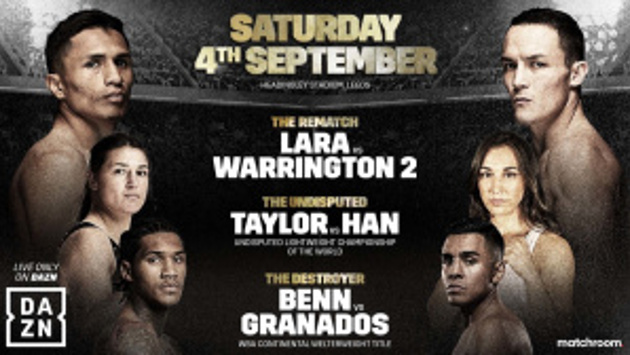 - Маурисио Лара (23-2, 16 КО) – Джош Уоррингтон (30-1, 7 КО) - Конор Бенн (18-0, 12 КО) – Адриан Гранадос (21-8-3, 15 КО) - Кэти Тейлор (18-0, 6 КО) – Дженнифер Хэн (18-3-1, 1 КО) - Джованни Страффон (24-3-1, 17 КО) – Макси Хьюз (23-5-2, 5 КО) - Эбани Бриджес (6-1, 3 КО) – Майлис Ганглофф (5-2, 2 КО) - Хоупи Прайс (5-0, 1 КО) – Захид Хуссеин (16-1, 2 КО) - Джек Бейтсон (13-0, 3 КО) – Феликс Гарсиа (7-2-1, 3 КО) - Брэндон Стенсфилд (1-0, 0 КО) – ЭмДжей Холл (2-62-2, 0 КО) - Мали Врайт (дебют) – Энтони Вулери (2-6, 0 КО)