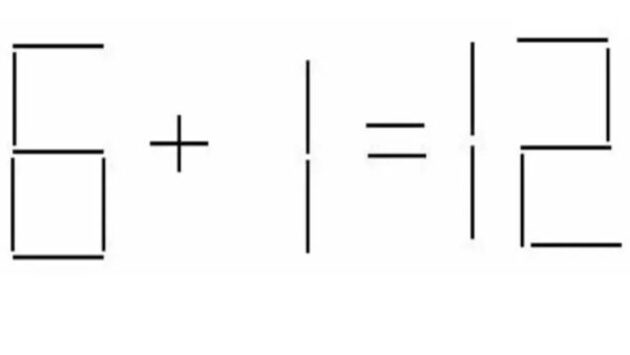 Дан пример: «6 + 1 = 12«. В нем есть ошибка, ваша задача сделать так, чтобы равенство стало верным. Для этого вы можете переставить 1 спичку на другое место.