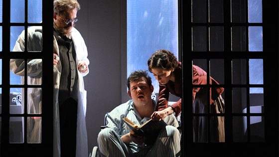 Все происходит в одной декорации (художник Стефания Филатова). В монолитной серой стене прорезаны раздвижные ворота типа гаражных. Вся конструкция стоит на подиуме, раскрашенном белыми и серыми диагоналями. Что может отсылать и к шахматам, но больше напоминает верстовые столбы или пограничные шлагбаумы. Часть действия вынесена на авансцену - герои симметрично располагаются по обе стороны ворот, как на средневековой гравюре. Пространство же за воротами превращается то в турнирный зал, то в лечебницу, то в дом невесты, то в офис кинофабрики - при этом над воротами загораются краткие титры, по-немецки для пущей зловещести.