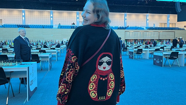 В первый день Валентина Гунина решила вопрос символики проще и честнее всех. Она пришла в свитере с матрешкой: теплом, ярком, абсолютно не вписывающемся в стерильный шахматный интерьер.