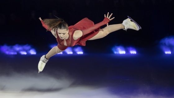 Олимпийская чемпионка в командном турнире Камила Валиева исполнила "С любимыми не расставайтесь" под живой вокал заслуженной артистки России Зары - и с высоты спустилось заветное треугольное письмо с фронта. А в номере, посвященном "непокоренному герою Ленинграду", на лед вышел весь звездный мужской состав спектакля - тринадцать фигуристов разных поколений.