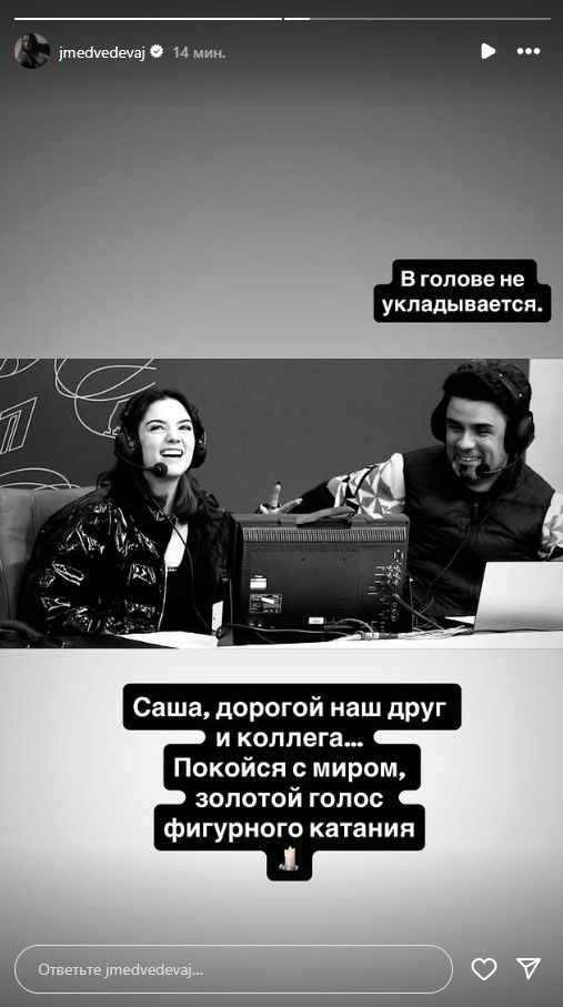 «В голове не укладывается. Саша, дорогой наш друг и коллега… Покойся с миром, золотой голос фигурного катания», — написала Медведева в социальной сети и опубликовала совместное фото с Гришиным.