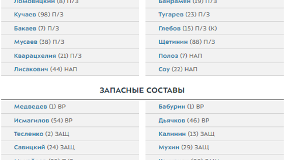 Запасные: Бабурин, Дьячков, Калинин, Мухин, Кочканян, Фольмер, Мельников, Сухомлинов, Количенко, Голенков, Турищев.