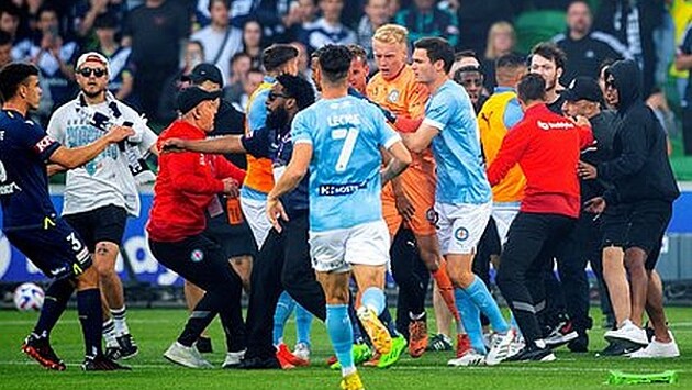 В Австралии фанаты выбежали на поле во время матча и подрались с футболистами