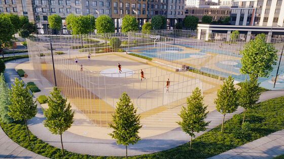 Площадь спортивного кластера составит 2,6 тыс. кв. м. Здесь оборудуют два поля: одно площадью 512 кв. м – для игры в футбол и волейбол, второе площадью 599 кв. м – для проведения баскетбольных матчей. Между ними установят трибуну для болельщиков. Для любителей воркаута появятся уличные тренажеры шести типов. Комплекс спортивных объектов по периметру будет обрамлять трасса памп-трека для катания и трюков на скейтбордах, роликах, самокатах и велосипедах. Кроме того, кластер и пешеходный бульвар свяжет беговая дорожка протяженностью около 1 км. На игровых полях и беговой дорожке уложат цветное гипоаллергенное покрытие, которое обеспечит дополнительную амортизацию и поможет избежать травм.