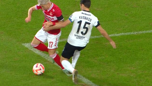 На 72-й минуте защитник «Урала» Денис Кулаков наступил на ногу вингеру «Спартака» Антону Зиньковскому. Судья Владимир Москалёв наказал футболиста гостей жёлтой карточкой. Однако матч был приостановлен из-за проверки VAR (работала арбитр Вера Опейкина) по поводу возможного пенальти. Часть стопы Зиньковского оказалась на линии штрафной во время нарушения. Тяжёлый момент.