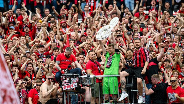Главный тренер «Байера» Хаби Алонсо и вратарь и капитан Лукаш Градецки отнесли трофей на фанатский сектор на «БайАрене» и отпраздновали первое в истории клуба чемпионство вместе с болельщиками.