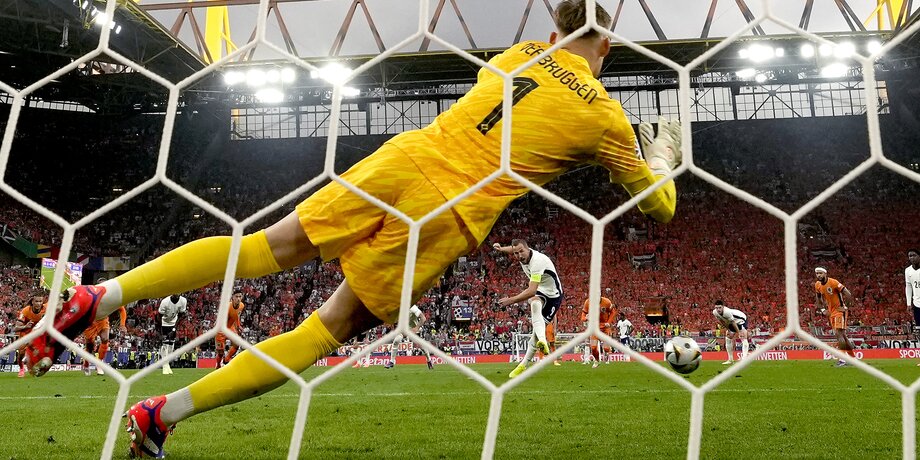 Пропущенный в дебюте мяч стал настолько мощным допингом для англичан, что сотни миллионов евро на поле выдали свой самый зрелищный тайм на турнире. Для начала капитан команды Харри Кейн приложился издали из центральной зоны – вратарь Нидерландов Барт Вербрюгген с летящим по низу мячом справился. А затем Кейн подкараулил отскок в штрафной и пробил выше, но наткнулся на летящие в него шипы бутс защитника "оранжевых" Дензела Дюмфриса. Увидев гримасы боли пострадавшего, главный арбитр матча Феликс Цвайер побежал к монитору, и на VAR разглядел повод для пенальти. Вербрюгген почти достал удар Кейна в правый нижний угол, но отбить его не сумел – 1:1 на 18-й минуте игры.
