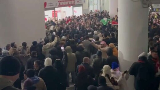Сирийские фанаты в подтрибунном помещении скандировали нецензурную кричалку, которую можно перевести на русский язык примерно как «идите к черту», в адрес США и размахивали флагами своей страны и Палестины.
