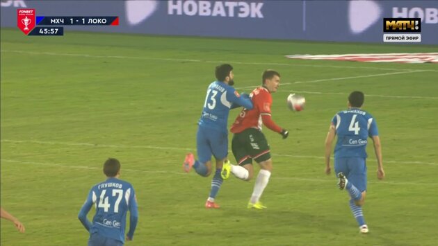 Примерно через 8 секунд после начала второго тайма защитник Сослан Кагермазов, пытаясь помешать форварду Дмитрию Воробьеву принять мяч после заброса и выбежать к воротам хозяев, подтолкнул соперника в спину, и тот упал на газон.