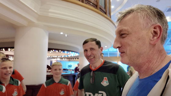 Дети увидели главного тренера 2D в отеле и поприветствовали его аплодисментами. Также к Кузнецову подошел тренер академии «Локомотива» Дмитрий Вязьмикин.
