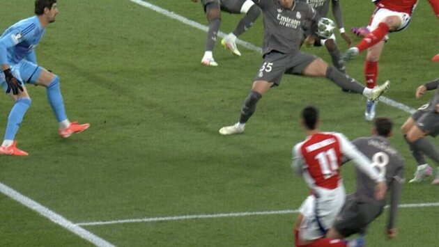 На 13-й минуте полузащитник хозяев Деклан Райс нанес удар по воротам из угла штрафной площади «Реала» – мяч с близкого расстояния попал в руку защитнику Раулю Асенсио.