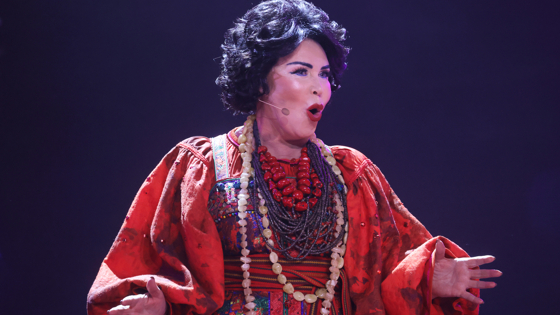 Надежда Георгиевна предстала в национальном костюме с казачьей шашкой в руке. Синее платье с орнаментом она дополнила массивными бусами. Кроме того, визажисты сделали певице яркий макияж: густо подвели глаза и брови, а губы выделили ярко-красной помадой.