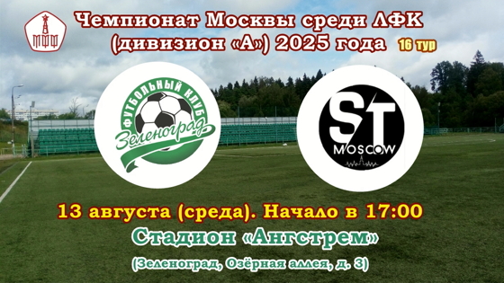 11.08.2025 На стадионе «Ангстрем» состоится игра 16-го тура Чемпионата Москвы среди ЛФК (дивизион «А»). Футбольный клуб «Зеленоград» примет на своём поле команду «СТ», у которой выиграл в матче первого круга со счётом 5:1. 6 августа на стадионе «Арена-Сокол» (Москва, Новорязанская улица), играя в неоптимальном составе, «Зеленоград» выиграл в товарищеском матче с молодёжной командой спортивной школы «Сокол» - 3:0. Мячи забили Артём Клюев и Михаил Каретников (2). Команду пополнил новичок – полузащитник Андрей Фандеев (род. 29.07.1994). Сообщаем положение команд в чемпионате по состоянию на 11 августа: 1. «Гермес» - 40 очков (14 матчей), 2. «Зеленоград» - 34 (13), 3. «Космос-М» - 27 (14), 4. «Локомотив-М» - 25 (13), 5. «Росич» - 22 (13), 6. «Спортакадемклуб» - 22 (15), 7. ФШМ – 22 (14), 8. ЛФК «Юность Москвы» - 21 (14), 9. ЛФК «Строгино» - 19 (15), 10. ФК «УМЦ» - 12 (14), 11. «Луч Тим» - 7 (14), 12. ФК «СТ» - 6 (14), 13. «Трудовые Резервы» - 1 (13). Футбольный клуб «Зеленоград» приглашает любителей спорта на футбол! Фото: Александр Тимаков