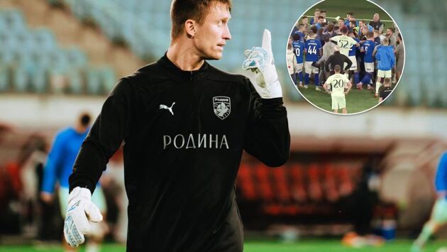 После финального свистка страсти полыхнули с новой силой. На поле началась потасовка, а в центре внимания оказался игрок «Родины» Артём Мещанинов, за которым погнались футболисты и сотрудники «Факела».