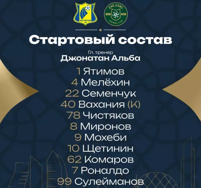 "Ростов" объявил стартовый состав на матч против китайского "Чжецзян Профешнл".