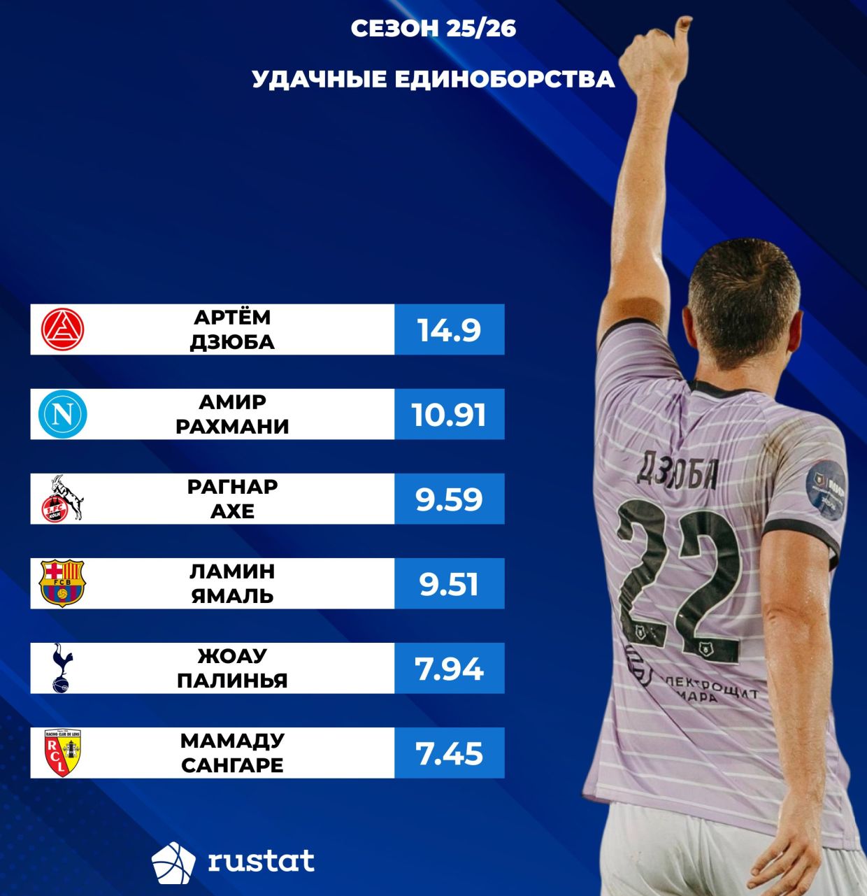 Рейтинг футболистов по количеству удачных единоборств в РПЛ и топ-5 лигах Европы: