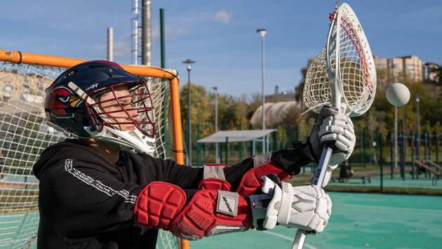 В первую очередь надеваю шлем, напоминающий хоккейный, ведь в нем есть стальная сетка, защищающая лицо игрока. Затягиваю ремешки на шлеме и закрепляю их защелками. Затем — налокотники и перчатки с мягкими подкладками, которые тоже схожи с хоккейными. Мне выдают клюшку с сеткой на конце в виде сачка, ее называют кроссом. В сетку кладу резиновый мяч. Его нужно донести через поле и забить в ворота соперника.