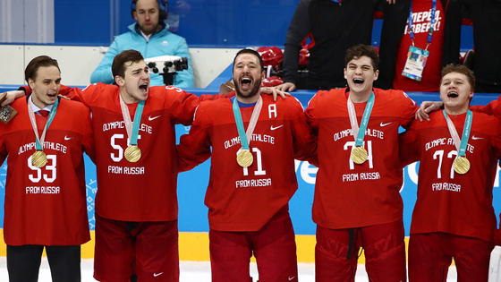 В воскресенье российские хоккеисты в финале олимпийского турнира обыграли сборную Германии в овертайме со счетом 4:3. Во время награждения спортсмены вместе с болельщиками пели российский гимн, когда на арене был включен олимпийский гимн.