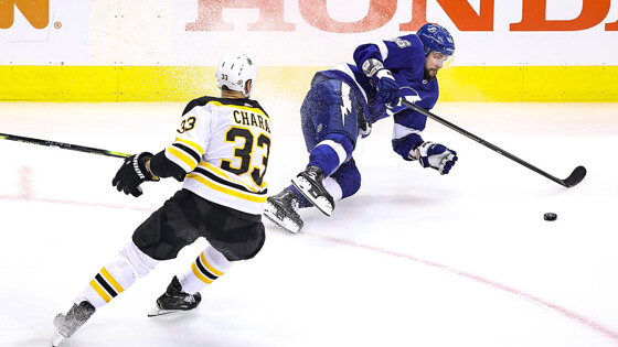 В Торонто на стадионе «Скотиабанк-Арена» проходит третий матч второго раунда Кубка Стэнли, в котором «Бостон Брюинз» принимает «Тампа-Бэй Лайтнинг» На момент написания новости проходит третий период. Счёт в матче 7:1 в пользу «Тампы». Седьмую шайбу за «Тампу» забросил российский нападающий Никита Кучеров. Результативной передачей отметился Брейден Пойнт. Права на видео принадлежат ООО «Яндекс». Посмотреть видео можно на сайте «Яндекс. Эфир». Ранее в этом матче россиянин сделал 3 результативные передачи, в том числе помог отличиться российскому защитнику Михаилу Сергачёву. Для Никиты Кучерова этот гол стал четвёртым в нынешнем розыгрыше плей-офф Национальной хоккейной лиги. На данный момент счёт в серии 1-1.