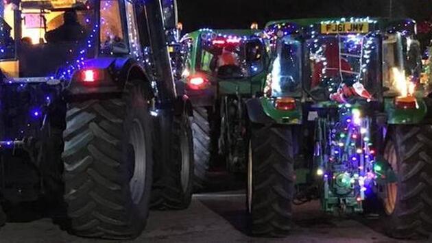 Тракторы были освещены рождественскими гирляндами, надувными Санта-Клаусами, а у одного даже была вращающаяся рождественская елка.