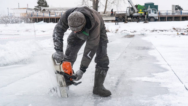 Погода наконец позволила пилить лед для кемеровской площади
