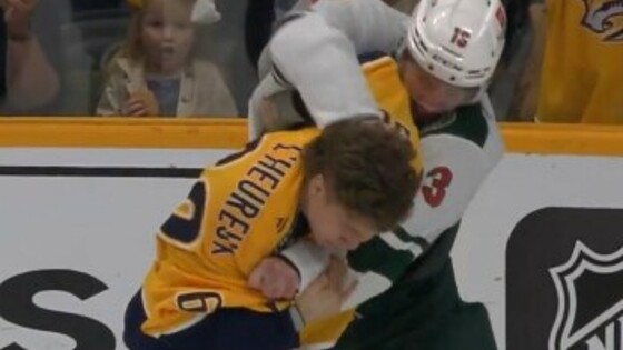 Российский нападающий Яков Тренин подрался с Закари Л’Эро, который ранее нанёс травму защитнику Джареду Сперджёну, в матче регулярного чемпионата НХЛ «Миннесота Уайлд» – «Нэшвилл Предаторз» (2:6).