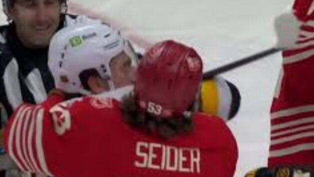 Немецкий защитник «Ред Уингс» заступился за новичка Эммита Финни, которого Задоров прижал ко льду у своих ворот.
