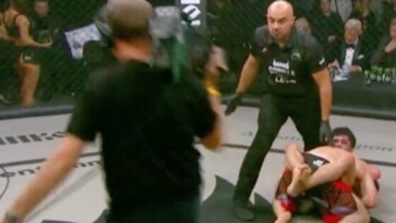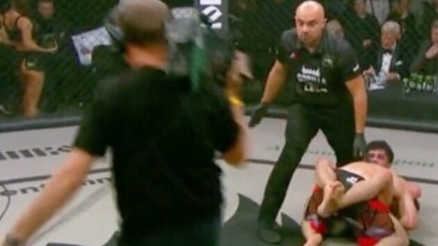 Бойцов не побеспокоил ни растянувшийся по центру клетки шнур камеры, ни дополнительный человек, находящийся рядом с ними. Они даже успели провести несколько комбинаций, прежде чем рефери приостановил бой.