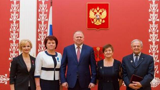 В пятницу, 6 октября, пятеро калининградцев получили почётные звания и государственные награды от полпреда президента в СЗФО Николая Цуканова. Об этом Клопс.Ru сообщили в пресс-службе полномочного представителя президента. Депутату и председателю Калининградской областной Думы Марине Оргеевой вручили "Орден почёта". Медалью ордена "За заслуги перед отечеством II степени" наградили министра социальной политики Калининградской области Анжелику Майстер и токаря ФГУП "Опытное конструкторское бюро Факел" Виктора Жилениса. Председатель Калининградского отделения Союза художников России Виктор Елфимов получил почётное звание "Заслуженный художник Российской Федерации". Врач Валентина Янушко, единственный в регионе нейроофтальмолог, 45 лет проработавшая в БСМП, получила почётное звание "Заслуженный врач Российской Федерации". Государственные награды калининградцам в торжественной обстановке вручил полномочный представитель президента РФ в Северо-западном федеральном округе Николай Цуканов.