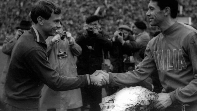 Нервы вне поля Матч должен был состояться на стадионе «Лужники» в присутствии 102 358 зрителей. Вместе со «скуадрой адзурри» в Москве высадился внушительный десант тифози со всей Италии. Пять тысяч молодцов прибыли в столицу на 28 самолетах. Зная итальянцев, даже в 60-е ждать от них спокойного поведения было более чем наивно. Тифози не только измучили сотрудников «Аэрофлота», но и посольство СССР в Риме. Слишком уж долго, по их мнению, оформлялись визы. Сотрудники спецслужб также негодовали. Уследить за армией итальянцев было не так-то просто, а обеспечение безопасности социалистического государства и его граждан от влияния Запада никто не отменял. К счастью для КГБ, опасных болельщиков собрали в одном месте в одно время – на стадионе «Лужники». Но тифози привезли с собой барабаны, флаги, дудки и прочие незаменимые атрибуты футбольного фаната. В СССР с таким знакомы не были и смотрели на итальянцев как на диковинных существ, чудом прицепившихся к космическому кораблю Гагарина и оказавшихся на Земле. Приятные советскому болельщику цифры на табло Советские любители футбола также испытывали трудности перед встречей, от чего сильно волновались. Позднее в интервью один из не сумевших попасть на стадион рассказал: «Для начала я примитивно встал в очередь. В 10 часов 6 октября уже стоял в плотной группе таких же оптимистов примерно в полутора километрах от касс Центрального стадиона. К 16 часам просвет сократился до 600 метров. Финиш состоялся у окошка с табличкой: «Все билеты проданы». Вот такая суровая реальность. Нервы болельщиков были на пределе. До начала игры Сборная СССР готовилась к важнейшему поединку в Подмосковье. Из-за приостановки внутреннего чемпионата на время Олимпиады, пришлось сильно нагонять. Футболисты выходили на поле дважды в неделю на протяжении почти полутора месяцев! И это накануне матча в 1/8 финала Кубка Европы! Современным футболистам сборной России, пожалуй, такое не приснилось бы и в кошмарном сне. Перед Константином Ивановичем Бесковым стояла очень сложная задача. Нельзя было перегружать и без того уставших футболистов, но и тонус поддерживать жизненно необходимо. В свободное от практических тренировок время разобрали игру итальянцев вдоль и поперек. «Скуадра адзурра» не сильно напрягалась на отведенных им двух тренировках в «Лужниках». Традиционно уповая на пуленепробиваемый «автобус» в своей штрафной площади, итальянцы проникались культурным богатством столицы. Наставник «скуадры»Эдмондо Фабри был предельно честен в интервью: «Для нас ничья равна победе». Разумная мысль. Отстоять ничью в гостях, а в Риме уже дожать измотанного соперника и забить нужный гол. «Лужники» молчат в память о погибших в Беллуно На плечах итальянской сборной лежала тяжелая ноша, привезенная с родины. В провинции Беллуно произошел горный обвал и наводнение, сотни человек погибли. Делегация «адзурры» сразу же заявила о выходе на поле в траурных повязках и попросила о проведении минуты молчания в память о погибших. Советская сторона отнеслась с солидарностью и стотысячные «Лужники» погрузились в гробовое молчание. В раздевалках все готово Итальянский наставник сразу же пошел на хитрость. Фаббри до последнего выжидал, когда же Бесков передаст протокол главному арбитру матча. Обслуживал игру поляк Рышард Банасюк. Не самый о