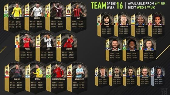 Каждую неделю EA Sports выбирает игроков, показавших лучшие результаты в матчах сборных и клубов по всему миру. Из этих футболистов формируется команда недели (Team Of The Week – TOTW), игроками которой можно сыграть в FIFA Ultimate Team. В 16-ю команду недели вошел бывший полузащитник «Анжи», ныне игрок «Челси» Виллиан, который в матче против «Сток Сити» (5:0) забил мяч и отдал две результативные передачи. Сильнейшими в этой команде стали Алексис Санчес («Арсенал»), Пауло Дибала («Ювентус») и Поль Погба («Манчестер Юнайтед»). Полностью 16-я команда недели FIFA 18 выглядит следующим образом: Основной состав: Эдерсон («Манчестер Сити»), Деян Ловрен («Ливерпуль»), Николя Н'Кулу («Торино»), Натан Аке («Борнмут»), Поль Погба («Манчестер Юнайтед»), Деле Алли («Тоттенхэм»), Джесси Лингард («Манчестер Юнайтед»), Алексис Санчес («Арсенал»), Пауло Дибала («Ювентус»), Роберту Фирмину («Ливерпуль»), Марко Арнаутович («Вест Хэм», 86). Запасные: Маттиа Перин («Дженоа»), Леандер Дендокер («Андерлехт»), Хосе Искиэрдо («Брайтон»), Мартин Брейтуэйт («Мидлсбро»), Роберт Снодграсс («Астон Вилла»), Виллиан ( «Челси»), Фабио Квальярелла («Сампдория»). Резерв: Дэнни Уилсон («Рейнджерс»), Адриан Межеевский («Сидней»), Мостафа Фати («Аль-Тавон»), Льюис Алессандра («Ноттс Каунти»), Джек Марриотт («Петерборо»).
