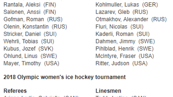 Стал известен окончательный состав судейского корпуса, который будет работать на матчах Олимпийского турнира 2018 года в Южной Корее. В список 14 вошли два лучших арбитра России:Константин Оленин и Роман Гофман. Также КХЛ в Корее представит чех Антонин Ержабек. В число лайнсменов включены россияне Глеб Лазарев и Александр Отмахов. Главные арбитры: Роман Гофман (Россия), Ольвие Гуэн (Канада), Ян Грибик (Чехия), Бретт Айверсон (Канада), Антон Ержабек (Чехия), Йозеф Кубуш (Словакия), Марк Лемелин (Австрия), Тимоти Майер (США), Линус Элунд (Швеция), Константин Оленин (Россия), Алекси Рантала, Ансси Салонен (оба — Финляндия), Даниэль Штрикер, Тобиас Верли (оба — Швейцария).