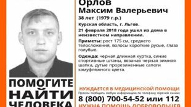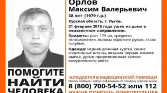 Поисковики отряда «Лиза Алерт Курск» просят помочь в поисках 38-летнего Максима Орлова, пропавшего 21 февраля во Льгове. В тот день он ушел из дома в неизвестном направлении и не вернулся. Поисковики сообщают, что мужчина нуждается в медицинской помощи. Подробности его заболевания не уточняются. В день исчезновения Максим Орлов был одет в черную длинную куртку, синие спортивные и дутые камуфляжные сапоги.