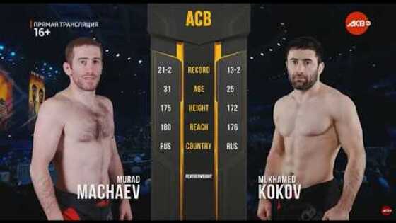 vRINGe.com предлагает вашему вниманию видеозапись поединка в рамках турнира ACB 86 по правилам ММА между Мурадом Мачаевым и Мухамедом Коковым, который состоялся 5 мая 2018 года в Москве (Россия). Напоминаем, что записи многих других поединков вы всегда можете найти в нашем видеоархиве. Информация для правообладателей: данная видеозапись находится в публичном доступе на стороннем сайте, посему команда ресурса vRINGe.com не несёт ответственности за то, что она содержит. По этой же причинe редакция нашего ресурса также не может гарантировать доступность видеозаписи сейчас или когда-либо в будущем. Спасибо за понимание. Подписывайтесь на аккаунт vRINGe.com в Twitter, Facebook и Вконтакте: в одной ленте — всё, что стоит знать о боксе и ММА.