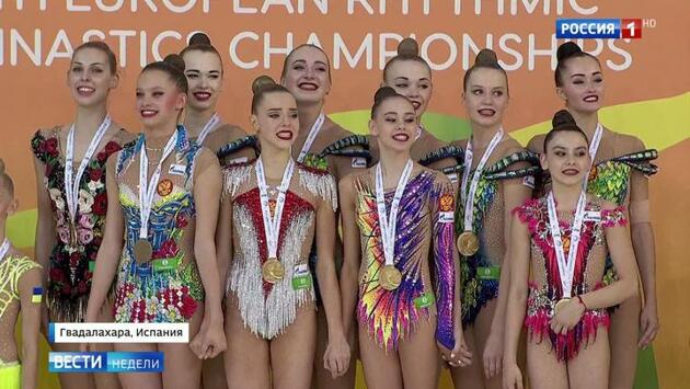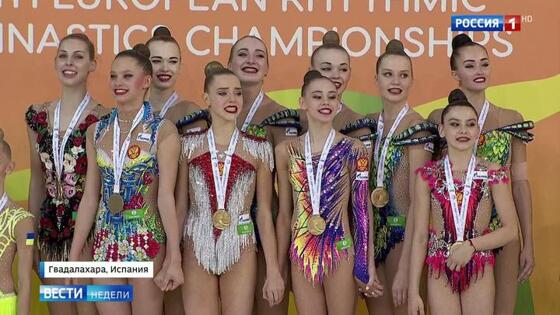 У нашей сборной по художественной гимнастике — золото на Чемпионате Европы в Гвадалахаре. В групповых упражнениях Россия выиграла у ближайших соперниц — украинок — более чем 10 баллов. Это — огромное преимущество. 3 июня — заключительный день соревнований. Болеем за сестер Авериных в личном зачете. Президент Европейского гимнастического союза напутствует гимнасток перед выходом на подиум. Гимн допеть можно и сразу спускаться — на поцелуи и фотографии нет времени: четыре награждения подряд. Вот они все по очереди на пьедестале почета. Поют. Лала Крамарекно — 13 лет. Даша Трубникова — 15. Полина Шматко – 15. И снова Лала. Действительно организаторам на этом чемпионате просто — не перепутаешь, кого награждать и чей гимн ставить. Четыре медали только за один день соревнований. А накануне? Юниорки опять на подиуме, но уже вместе со взрослыми, с нашей шестеркой — это специальная медаль Чемпионата Европу, в копилку идут баллы всей сборной. Зарабатывали вместе и гимн поют все вместе. Как только Ирины Винер на всех сил хватает?! Она и на каждой тренировке — пока разогреваются и в коридоре — глаз не спускает со спортсменок. С девочками работает психолог — помогает убрать ненужный страх, волнение. Шесть раз зал слушал гимн России. На кону — еще три медали. И самая зрелищная — в индивидуальном многоборье. Сестры Аверины. Все здесь надеются, что в спор между Диной и Ариной никто не посмеет вмешаться.