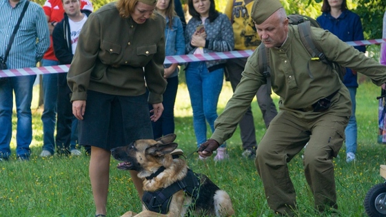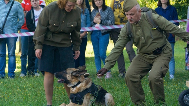 На территории столичного Музея Победы прошел фестиваль «День фронтовой собаки». Праздник был посвящен подвигам служебных собак в годы Великой Отечественной. На открытой площадке музея зрители увидели ожившие страницы истории войны. Кинологи из клуба «Х Легион» и их питомцы реконструировали: подвиг легендарной овчарки Дины, которая сумела выжить, осуществив подрыв вражеского эшелона; задержание диверсантов на границе, спасение раненых и службу собак-разведчиков. — Памятник «Фронтовой собаке» — один из первых, установленных Российским военно-историческим обществом. На фронтах Великой Отечественной войны было более 60 тысяч собак. Они доставляли медикаменты, боеприпасы и боевые донесения. Были связистами, диверсантами и разведчиками. Многие тысячи наших раненых бойцов собаки-санитары вынесли из-под обстрела, тем самым спасая им жизнь. Мало кто знает: когда хозяева сдавали собак на фронт, в случае, если собака погибала — на нее присылали похоронку. Была мобилизация военных, но была и мобилизация собак. Это уникальное явление. Недаром фронтовые собаки прошли Победным маршем 24 июня 1945 года на Красной площади. Наши четвероногие воины и сегодня несут свою службу. Славные традиции кинологической службы продолжаются! — сказал Михаил Мягков, научный директор Российского военно-исторического общества. Подразделение Росгвардии со служебными собаками из кинологического учебного центра дивизии имени Феликса Дзержинского показали навыки специальной подготовки — задержание нарушителей и поиск взрывчатых веществ. Показательные выступления представили также кинологи ДОСААФ. Напомним, в 2013 году по просьбам ветеранов Великой Отечественной войны РВИО установило памятник «Фронтовой собаке» на территории Музея Победы. Скульптор — Андрей Коробцов. Торжественная церемония была приурочена к 104-й годовщине создания в России первых кинологических подразделений (21 июня 1909 года).