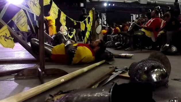 Второй день рыцарского турнира "Кубок Динамо" стал даже более насыщенным, нежели первый. Женские бои, рыцарские поединки за Кубок Донжона и "12 на 12"... Вначале, пожалуй, я скажу несколько слов о женских боях. Не секрет, что девушек в "стальном рыцарстве" существенно меньше, нежели молодых людей, и это более чем понятно и объяснимо. Даже для того, чтобы просто носить доспех (вес которого достигает порой трех десятков килограмм), требуется приличная физическая форма и хорошее здоровье. А если добавить к этому тяжесть клинка вместе с необходимостью не просто стоять на месте, а активно двигаться со всем этим снаряжением, - думаю, многие согласятся, что девушка, решившаяся стать рыцарем и (главное!) сумевшая это сделать, достойна всяческого восхищения. Мне приходилось слышать недовольные мнения: мол, удел женщины - мягкость и красоты, рождения детей и семейный очаг. Но каждый волен сам выбирать свою дорогу, и лично я могу только пожелать каждой из участниц турнира дальнейших успехов, здоровья не менее железного, чем те доспехи, которые они носят и совершенствования своих боевых навыков, приносящим им победы, а нам - потрясающие зрелища. Вначале, в утренней части "Кубка", проводились женские отборочные бои "5 на 5", где первое место заняла команда под патриотическим названием "Катюша". Когда команды, занявшие призовые места, выстраивались на ристалище для награждения, возник маленький забавный момент задумчивости - а кто же именно будет вручать им награды? Проблему решили просто и быстро: "Давайте сюда самого красивого легионера!" И "римлянин" в пышном костюме был наделен почетным правом вручить девушкам их заслуженные награды. Затем стартовали и женские бои за Кубок Донжона. Поединки проводились один на один, каждой из двадцати одной участниц турнира предстояли тяжелые бои, и вот наконец определилось три победительницы, завоевавших свои награды упорством, ловкостью и исключительным боевым искусством. На первом месте оказалась Мещерякова Анастасия из клуба "Берн", на втором - Рогозовская Ира, прибывшая на "Кубок Динамо" из Израиля, третье же заняла Головина Марина из российского клуба "Тверд". Малый же Кубок Донжона, являющийся индивидуальным зачётом по итогам года, обрела та же Мещерякова Анастасия. Между поединками иногда образовывались временные "просветы". Порой кто-то отказывался от дальнейшего участия в турнирных боях (тогда его сопернику присуждали техническую победу), и требовалось пусть небольшое, но время для того, чтобы бойцы, чей выход планировался после отмененного боя, могли закончить подготовку и явиться на ристалище. Кстати, сами боевые раунды длились по 1,5 минуты, между которыми давался перерыв длиною всего в сорок пять секунд. Причем в эти секунды входило время, за которое боец доходил до своего края ристалища и возвращался к маршалу-распорядителю... таким образом, на сам отдых оставалось чуть более полуминуты. И, раз уж речь зашла о времени, добавлю, что на починку или поправку снаряжения бойцу давалась минута, в редчайших случаях - две, и за такую поломку с бойца снималось три очка, равно как и за потерю оружия во время боя. В то время, как бойцу помогали внести необходимые поправки в снаряжение, его соперник имел возможность передохнуть, прислонясь к краю ристалища. Перерывы между боями происходили и в том случае, когда один и то