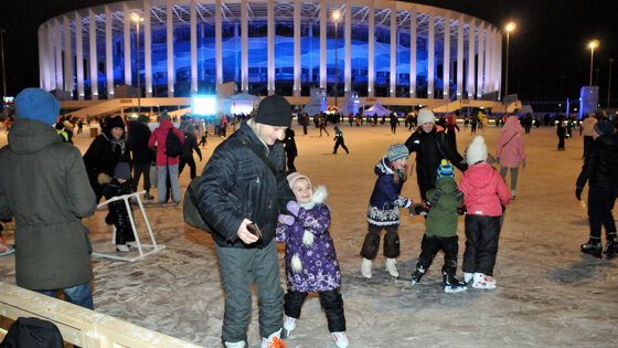 Фото Александра Воложанина«Сказка» к нам приходитСверкающая разноцветными гирляндами ёлочка-красавица, сказочные олени из чудо-огоньков, «Резиденция Деда Мороза», деревянные домики, в которых торгуют снедью и сувенирами, и невероятных размеров гигантский каток! В минувшую субботу на территории стадиона «Нижний Новгород» открылась развлекательная площадка «Зимняя сказка» – крупнейшая в регионе. Жаркий лёд стадиона Она заняла площадь в 20 тысяч квадратных метров. В первые дни работы её посетили 15 тысяч человек. В день открытия народу на стадионе, конечно, было – не протолкнуться! Сразу вспомнились жаркие деньки чемпионата мира по футболу. Жёлтая «река» шведов, бело-голубые баннеры аргентинцев, зажигательные танцы костариканцев, красно-белые шашечки маек хорватов. Полюбившиеся всем уругвайцы, ставшие после мундиаля боругвайцами, и, конечно, чемпионы мира красавцы-французы. Вот бы вернуть всех, да в наш декабрьский морозец, да на коньки! – Чемпионат мира дал нам хороший опыт, – отметил министр спорта Нижегородской области Сергей Панов. – «Зимнюю сказку» организуют те же люди, что и фан-зону на площади Минина. Поэтому особых проблем при таком массовом скоплении людей на стадионе нет. Быть спортивным в Нижегородской области становится модным. Мы стараемся сделать так, чтобы у нижегородцев была возможность заниматься физкультурой и спортом круглый год. Каток – одна из возможностей исполнить эту мечту. Надеюсь, благодаря ему здоровых людей у нас станет больше. Молодую пару Ксению и Алексея на лёд привела, скорее, романтика. Но как знать, может, этот совместный поход на каток станет в дальнейшем одной из традиций их семейной жизни. Родителей с детьми на «Зимней сказке» было очень много! От Нового года до 8 Марта – Мы коньки любим, – рассказывает глава одной семьи папа Андрей. – С детства привыкли на хоккейной коробке во дворе гонять. Поэтому, когда появились свои дети, долго с Инной, – кивает он в сторону супруги, – не раздумывали: поставили ребятишек на коньки. И хотя Александра (ей 4 года) занимается танцами, а 10-летний Андрей – боец кудо, катаются они с удовольствием! А настоящее мастерство в фигурном катании продемонстрировали участники ледового шоу Ильи Авербуха, которые показали часть своей программы на открытии «Зимней сказки». – Такой масштабный проект развернулся в Нижнем Новгороде! Для нас большая честь приехать сюда и стать частью церемонии открытия этого катка. Мы приехали по приглашению губернатора Нижегородской области Глеба Никитина. Здорово, что удалось задействовать территорию вокруг стадиона, – подчеркнул Илья Авербух, заслуженный мастер спорта России. Оксана Домнина и Максим Шабалин, Албена Денкова и Максим Ставиский, Мария Петрова и Алексей Тихонов, Евгений Кузнецов, Роман Костомаров – сотни нижегородцев пришли посмотреть на выступление прославленных российских фигуристов. Катались они сказочно! Волшебным был и весь вечер: огни, музыка, призы и подарки, мастер-классы и различные шоу. С открытием «Зимней сказки» нижегородцев поздравили и.о. заместителя губернатора Нижегородской области Александр Югов, депутат Государственной думы Денис Москвин. Дед Мороз водил хоровод, а хоккеисты «Торпедо» устроили викторину. – Вспоминая чемпионат мира по футболу, хочется, чтобы атмосфера этого спортивного праздни