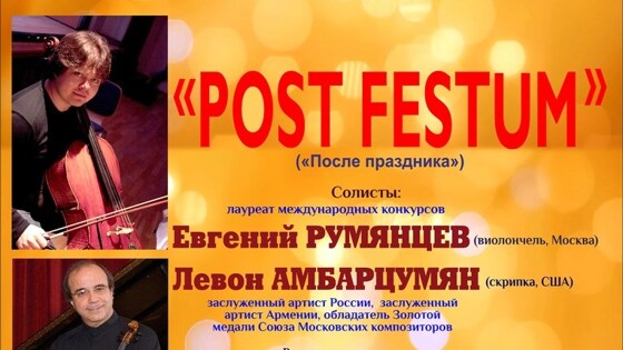 Помимо Евгения Румянцева, солистом на концерте "Post festum" выступит заслуженный артист РФ и Армении Левон Амбарцумян. Он исполнит концерт Подгайца "Времена года в Москве" для скрипки и оркестра народных инструментов. Зрители также услышат "Половецкие пляски" из оперы "Князь Игорь" композитора Александра Бородина, "Праздничную музыку" Сергея Слонимского и фантазию на тему оперы Джорджа Гершвина "Порги и Бесс". Концерт состоится в Липецком киноконцертном зале Унион им. Т.Н. Хренникова 15 марта.