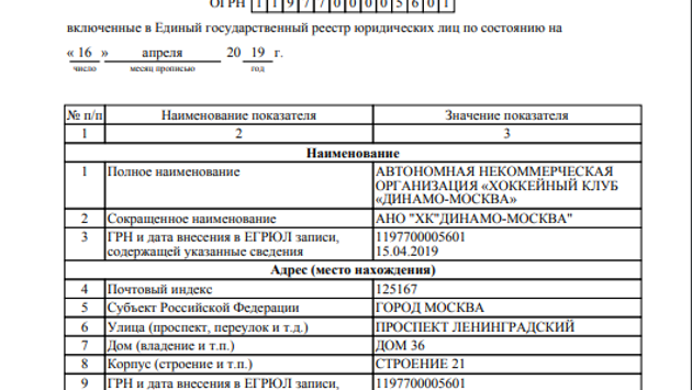 В распоряжении «Чемпионата» оказался документ, свидетельствующий о включении в Единый государственный реестр юридических лиц Автономной некоммерческой организации «Хоккейный клуб «Динамо» Москва». Документ зарегистрирован управлением Федеральной налоговой службы по городу Москве и датирован 16 апреля 2019 года. Генеральным директором организации является Евгений Кровопусков. C 2000 по 2012 года Кровопусков занимал различные должности в секретариате и совете министров союзного государства России и Беларуси. С 2013 года являлся заместителем генерального директора московского «Динамо». В этом сезоне в чемпионате КХЛ участвовала организация ООО «Динамо» Москва, генеральным директором которой является Валерий Шанцев. На 18 апреля намечен совет директоров московского «Динамо», по итогам которого ожидаются официальные изменения в руководстве хоккейного клуба.