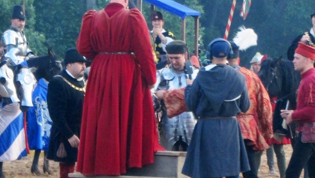 Финал оказался неожиданным, непредсказуемым, удивительным не только для публики, но и для организаторов турнира. Победителем Турнира Святого Георгия стал дебютант Илья Савельев, оказавшийся в числе участников турнира почти что случайно - им заменили выбывшего из состава участников Алексея Малинина. Молодой оруженосец, начавший свою турнирную карьеру лишь в этом году и успевший поучаствовать только в одном-единственном турнире, по стечению обстоятельств ставший участником Турнира Святого Георгия... неожиданно сумел взять главный приз турнира (в этом году главным призом стал меч)! Но обо всем по порядку. После торжественного появления на поле состава судей во главе с маршалом и Суда дам на поле начали выезжать рыцари, не имеющие возможности далее состязаться за главный приз Турнира Святого Георгия. Первым выехал Марк Амель. Напомню, что Амель совсем недавно принимал участие в Турнире святого Иво в Австралии и получил там серьезную контузию. Тем не менее рыцарь нашел в себе силы прибыть Из Квебека (Канада) в Россию, чтобы сдержать слово и принять участие в Турнире Святого Георгия. Однако вскоре после начала турнира судейская коллегия, посовещавшись, запретила Марку принимать участие в джостинге ради сохранения его здоровья. Вторым был Дмитрий Савченко, являющийся организатором Турнира Святого Георгия. В результате перелома фаланги пальца он также был вынужден отказаться от состязаний боевого характера. Третьим стал Доминик Сьюэлл, гость из Великобритании. К сожалению, Сьюэлл получил серьезный удар в плечо по время меле (конной "свалки") и потому не мог продолжать состязаться с другими рыцарями за первое место на турнире. Четвертым оказался Алан Мину. Рыцарь недобрал очков, поэтому не был допущен к участию в финале турнира. Напомню, по какой причине рыцари "уходили в минус" по решению судей - удары ниже пояса жестоко штрафовались, лишая рыцаря сразу десяти очков. Именно поэтому Алан Мину не принимал участие в финале, хотя его рыцарские таланты не подлежат сомнению. Теперь о тех, кто состязался за первое место Турнира Святого Георгия. Рыцари выезжали в порядке набора очков, от самого низкого до самого высокого результата. Отдельно стоит упомянуть о Павле Калинкове, приехавшем из Минска и впервые участвующем в Турнире Святого Георгия. Он выезжал первым, набрав минимальное количество очков, необходимое для допуска к финалу - 0. Подчеркну, именно набрав, потому что Павла дважды штрафовали за слишком низкие удары (хотя ни один из них не привел к травме соперника). Таким образом, Калинков набрал в течение турнира целых 20 очков! 11 из них он сумел получить в субботу, потрясающе пройдя конные состязания со снарядами и показав в них лучший среди всех рыцарей результат. Далее на поле выезжали Эндрю Маккиннон, Илья Савельев (обратите внимание, будущий победитель турнира был на 6 месте из 8), Тома Мену, Дмитрий Свентицкий, Виктор Ручкин, Юрий Богунов и Андрей Камин, трехкратный победитель Турнира Святого Георгия. Во время первой из сшибок сошлись двое рыцарей, имевших самый низкий и самых высокий результат, Павел Калинков и Андрей Камин. И тогда всех присутствовавших постигло первое удивление - внезапно Камин проиграл сшибку! Опытный рыцарь, которому многие прочили победу в четвертый раз, выбыл уже в четвертьфинале! Второй выезд. Виктор Ручки
